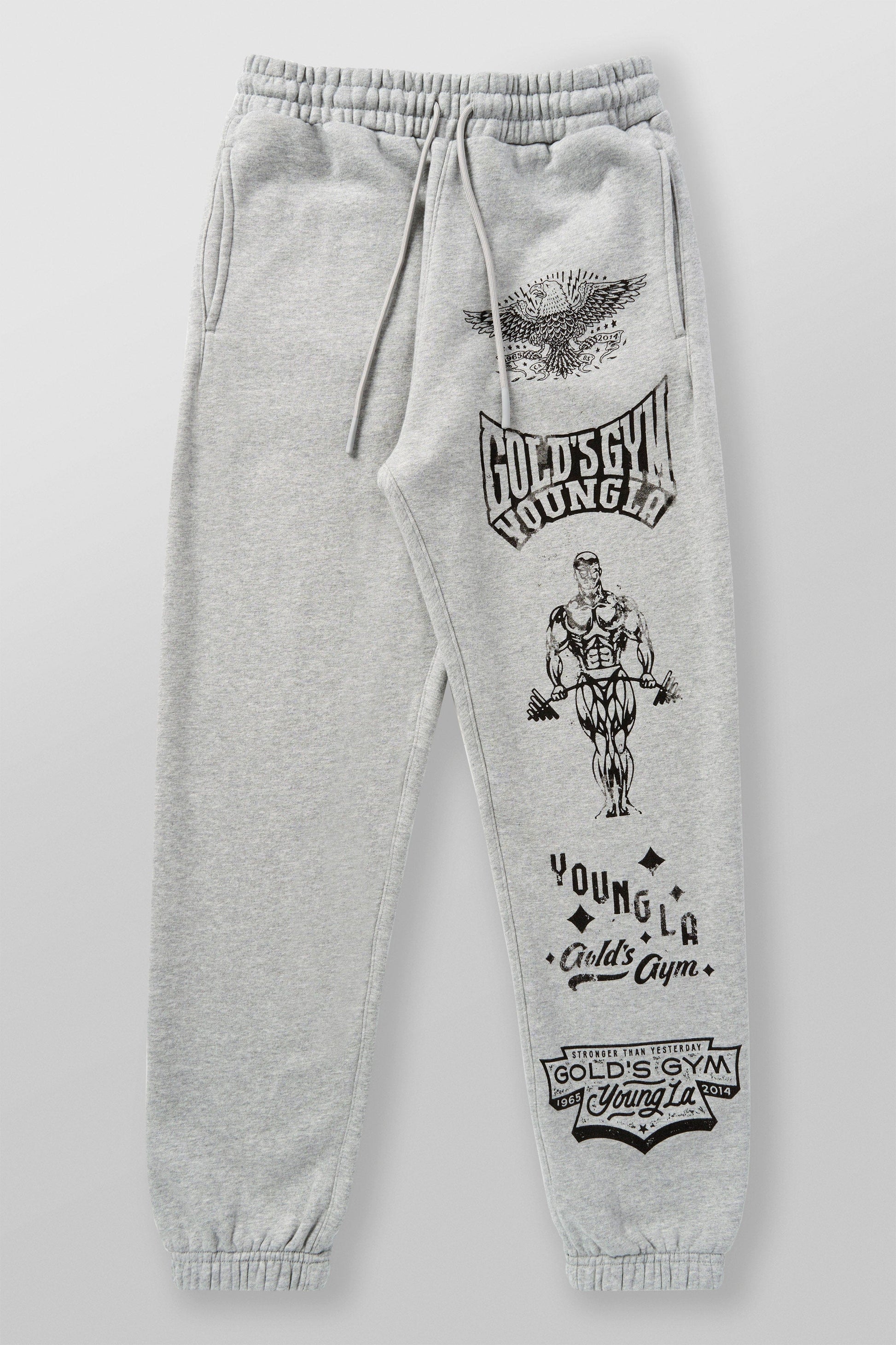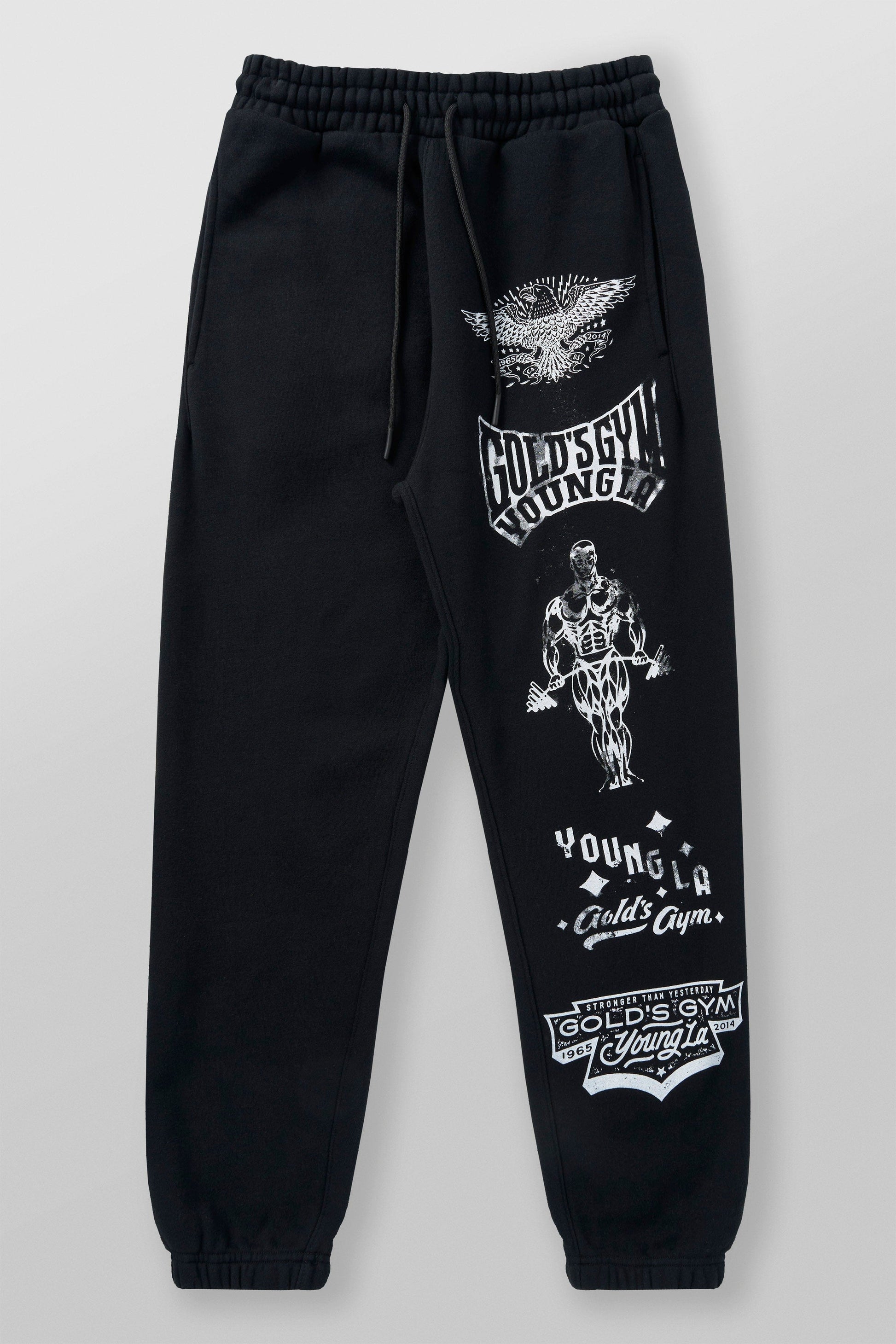 DESIGN: Introducing the Gold¡¯s Gym x YoungLA cuffed joggers ¨C inspired by YoungLA¡¯s best-selling Immortal Joggers. These joggers feature bold printed logos along one leg, blending classic gym heritage with modern streetwear style. Perfect for comfort and style, they bring the iconic look of Gold¡¯s Gym to a versatile everyday piece.