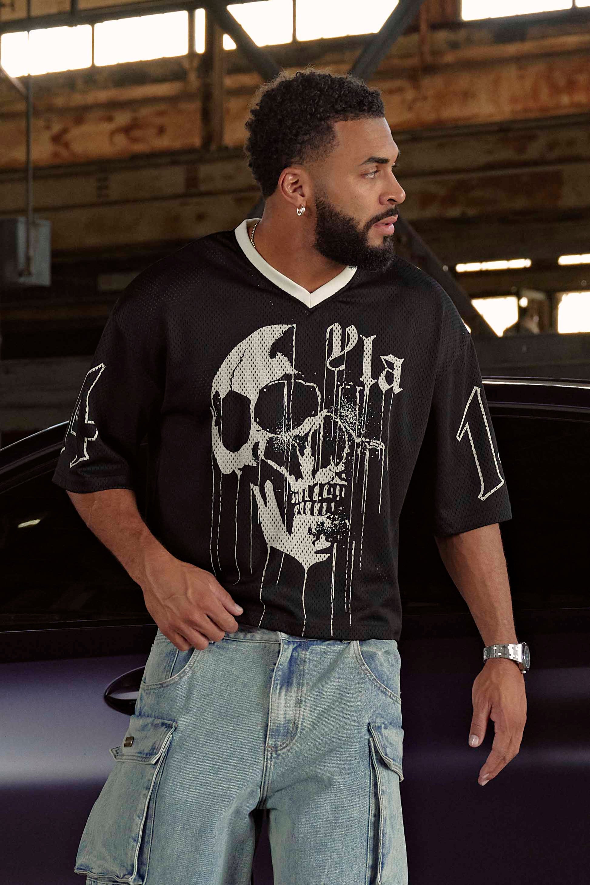 DESIGN: Step up your game with our modern-fit Football Jersey, designed for style and performance. Featuring a striking dripping skull print on the chest, this jersey exudes edgy appeal. The number 14 emblazoned on the sleeves adds a classic sporty touch. Perfect for both on and off the field, this jersey ensures you stay comfortable and fashionable.
